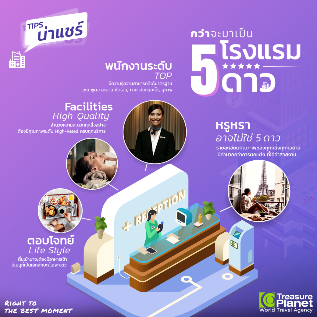 นอกจากหรูกว่า สบายกว่า และ ‘แพง’ กว่าแล้ว เพื่อนๆ เคยสงสัยกันไหมครับว่า มีเรื่องใดอีกบ้าง ที่เป็นตัววัดการประเมิน “โรงแรม 5 ดาว” อีกบ้าง? -พนักงานระดับ Top : ตั้งแต่ Concierge (ผู้กุมกุญแจทอง) , Porter (จัดการสัมภาระ), Check in ไปจนถึงแม่บ้าน ที่นอกจากจะต้องมีครบแล้ว ยังต้องมีความรู้ความสามารถ